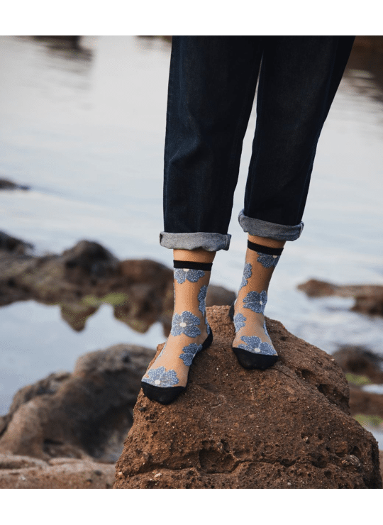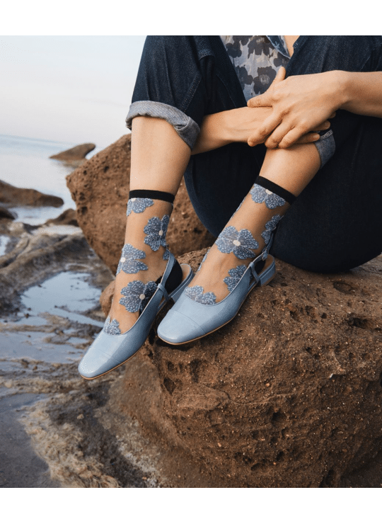 Verfijn je look met deze transparantblauwe sokken met sierlijke bloemmotieven, geïnspireerd op het fleurige Venetië. De ideale finishing touch bij een blauwe of beige jeans of lange rok. Draag ze met sneakers, pumps of loafers voor een stijlvolle, vrouwelijke look.