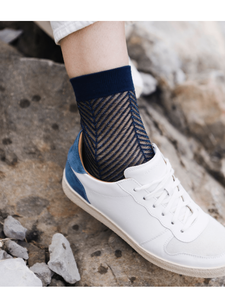 Eenvoudig en toch bijzonder. Deze glinsterende transparante sokken met geometrisch dennennaaldmotief maken elke look af. Perfect bij een jeans of witte broek.