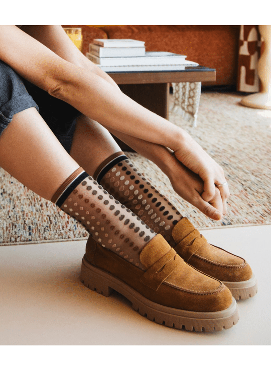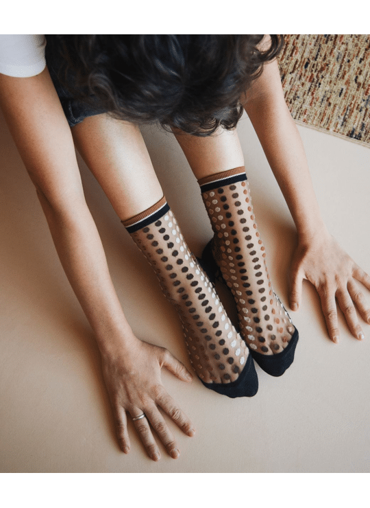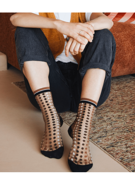 Breng je outfit tot leven met deze transparante kousen, versierd met vrolijke stippen. Mooi in combinatie met jeans of een zwarte broek. Of combineer met bruine en beige tinten voor nog meer effect. Draag ze met sneakers, pumps of loafers: instant stijlvol.
