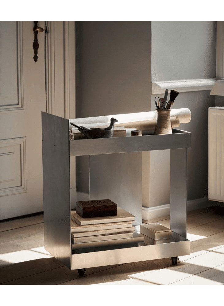 Vernoemd naar het Deense woord voor ‘magazijn’, haalt de Lager Trolley haar inspiratie uit de rauwe, industriële esthetiek van het brutalisme.