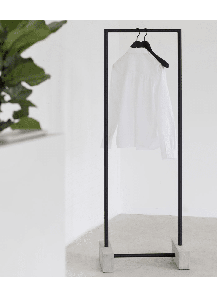 Een voet in beton en een frame in zwart gelakt staal. Meer is er niet nodig om een kledingrek te creëren dat in elke ruimte ingezet kan worden.
