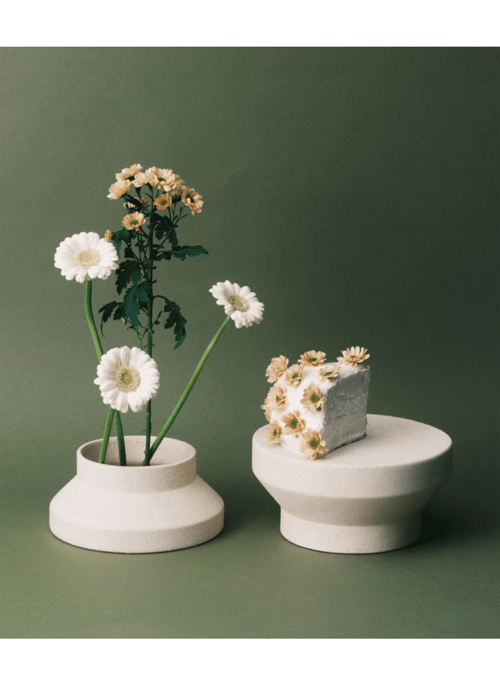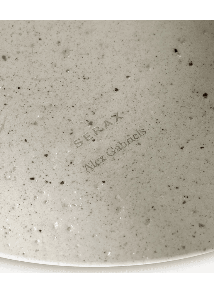 Dit veelzijdige object, ontworpen door Alex Gabriels in chamotteklei, kan zowel als vaas als taartschaal worden gebruikt. Perfect voor wie houdt van functioneel design met een speelse twist.
