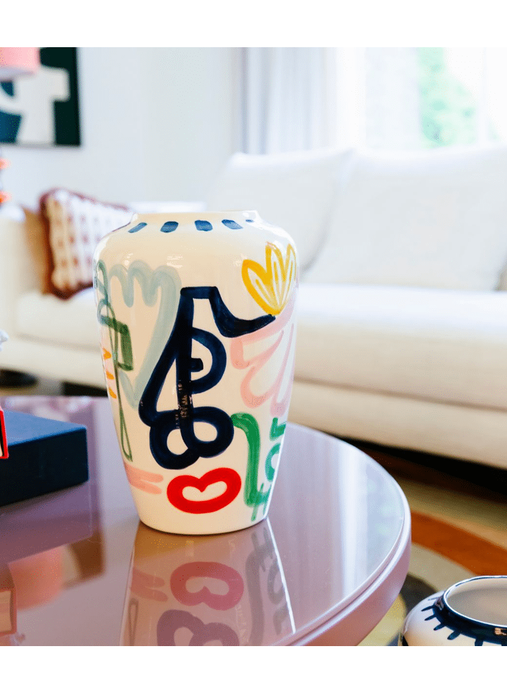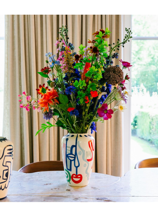 Prachtige met de hand beschildere vaas uit keremiek van Val Pottery in samenwerking met Julie Loeckx, gekend voor haar grafische ontwerpen boordevol kleur. Een echt collectors item boordevol karakter, zorgvuldig verpakt in een stijlvolle geschenkdoos.