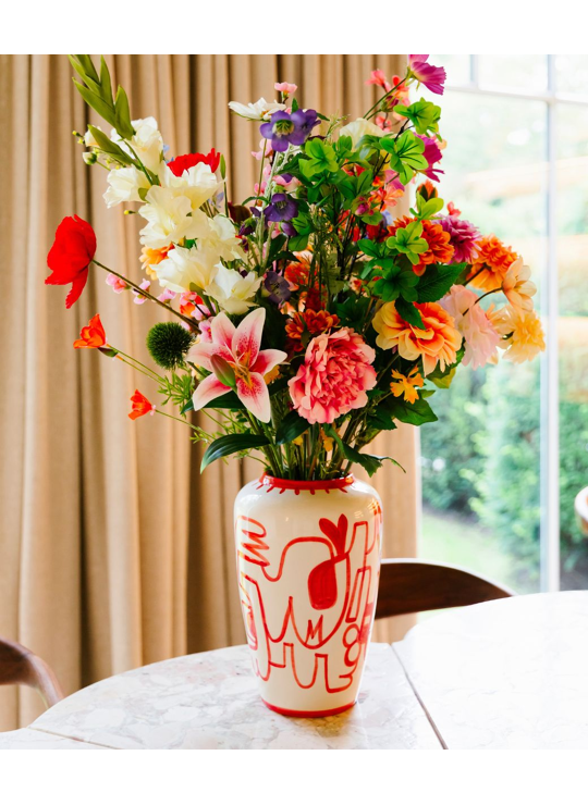 Prachtige met de hand beschildere vaas uit keremiek van Val Pottery in samenwerking met Julie Loeckx, gekend voor haar grafische ontwerpen boordevol kleur. Een echt collectors item boordevol karakter, zorgvuldig verpakt in een stijlvolle geschenkdoos.