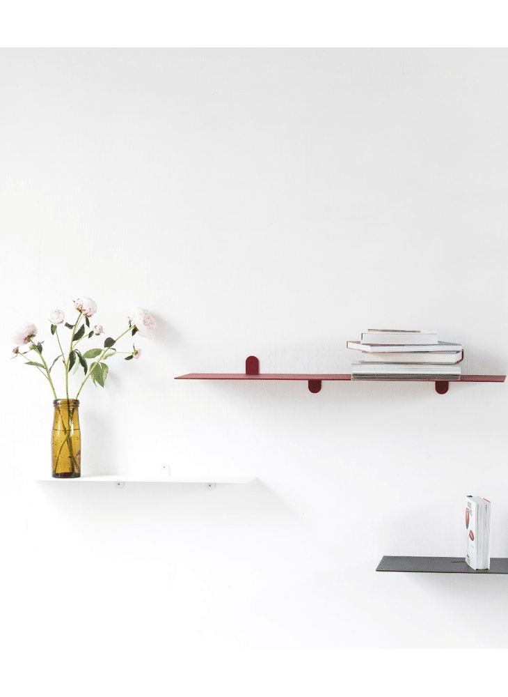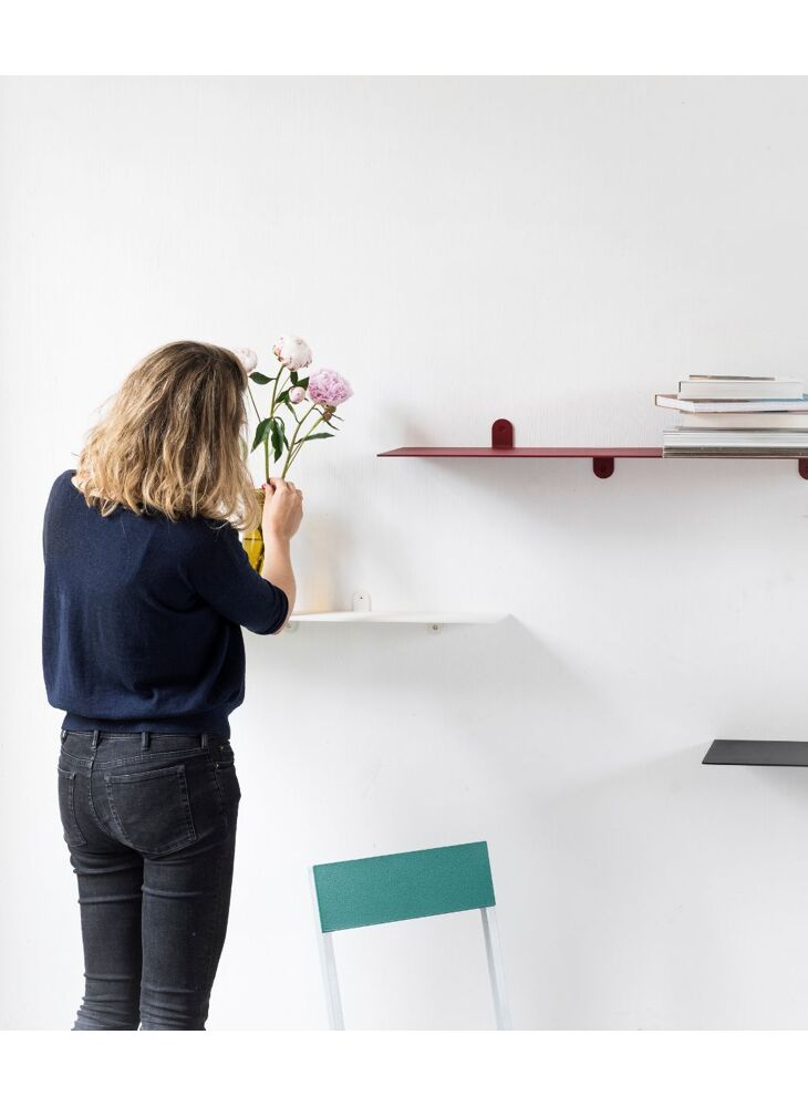 Muller Van Severen brengt het gegeven van een rek terug tot zijn essentie. Het bestaat uit één stalen plaat en verder niets. Zelfs de beugels zijn lasergesneden flappen op de rand van de plaat zelf, omhoog en omlaag gevouwen, zonder visuele obstructies.
