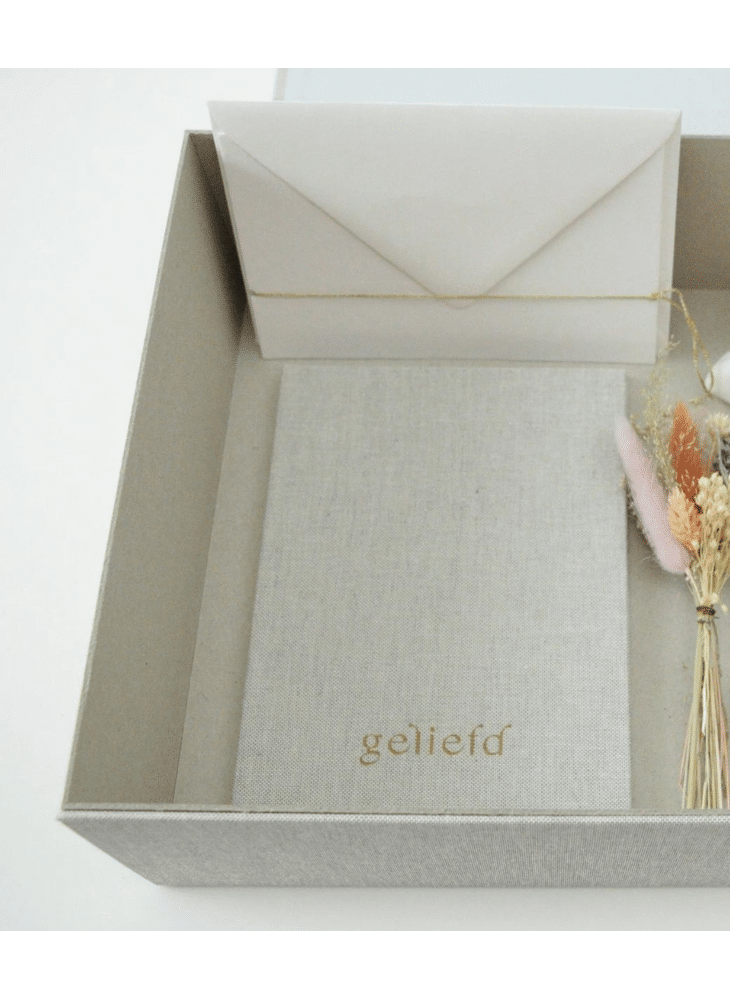 Een linnen koesterdoos om zelf te vullen met deelnemingskaarten en persoonlijke herinneringen. Op de voorkant staat de tekst "zachte troost" gedrukt, een liefdevolle gedachte aan warme momenten.