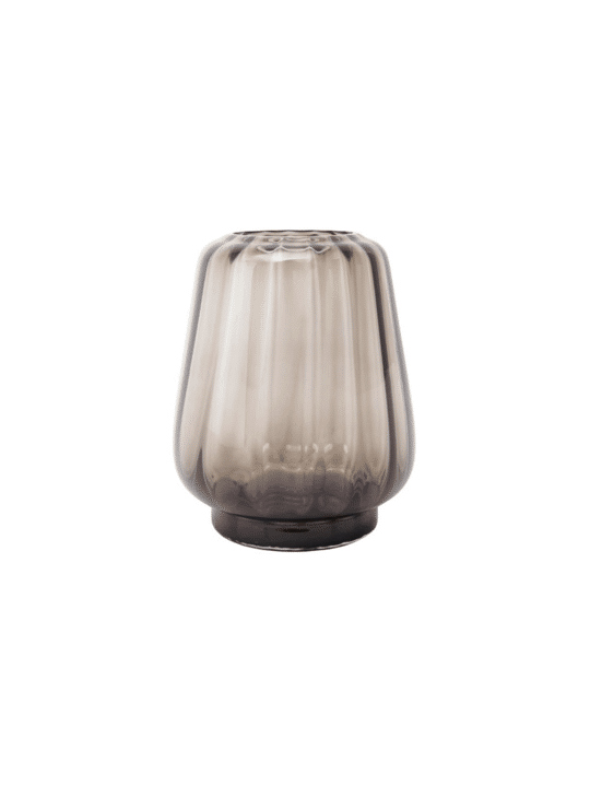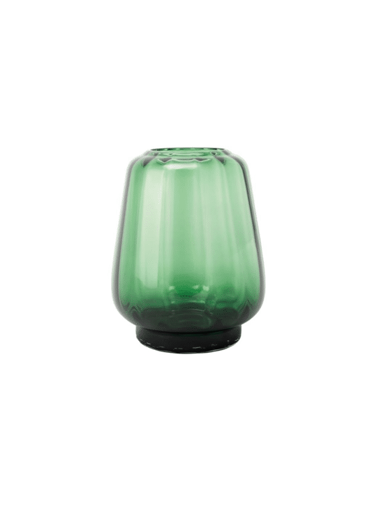 Licht en schaduw spelen over het geribbelde oppervlak. De zachte golven en transparante kleuren geven de vaas een rustige helderheid. Mooi met of zonder bloemen.