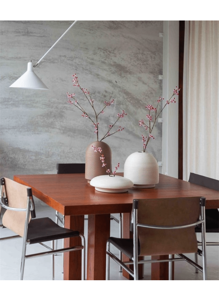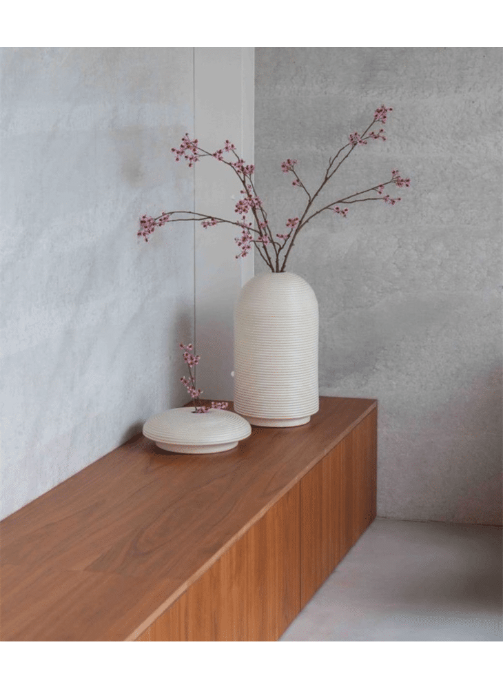Nova verbindt traditie en innovatie. De ribbelstructuur verwijst naar oude pottechnieken én naar de precisie van 3D-print. Met hun strakke vormen en aardse karakter roepen de vazen een gevoel van architectuur en ambacht op, terwijl de grafische composities een speels accent geven.