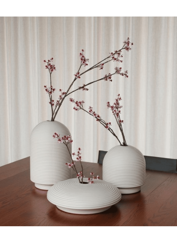 Nova verbindt traditie en innovatie. De ribbelstructuur verwijst naar oude pottechnieken én naar de precisie van 3D-print. Met hun strakke vormen en aardse karakter roepen de vazen een gevoel van architectuur en ambacht op, terwijl de grafische composities een speels accent geven.
